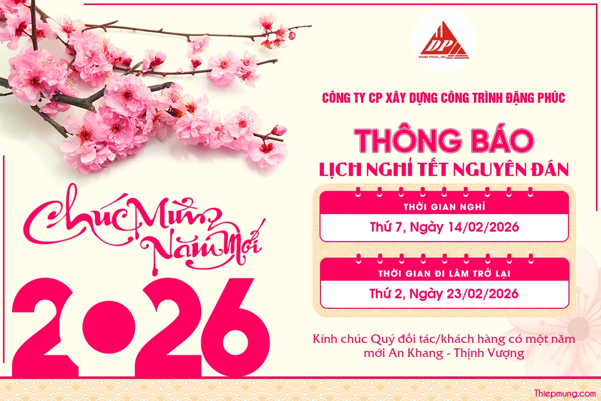 Trong không khí hân hoan chào đón năm mới Bính Ngọ 2026, Công ty Cổ phần Xây dựng Công trình Đặng Phúc xin gửi lời cảm ơn chân thành nhất tới Quý đối tác/khách hàng đã luôn tin tưởng và đồng hành cùng chúng tôi trong suốt thời gian qua.